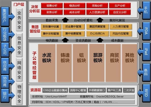 该大型企业集团的信息化系统采用‘集中部署 分布部署’的方式,通过构建统一的信息化管理平台,来实现‘工厂经营层、板块管理层、集团管控层’三级应用,和‘财务集中、营销集中、采购集中、人力资源集中、投资决策集中’五大集中,并最终实现工厂现场管理数字化、板块经营管理规范化、集团管控经营一体化等企业业务全面信息化应用。