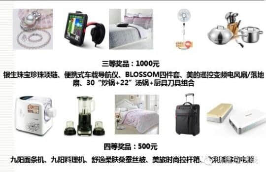 四等奖:价值500元的实用生活用品任选:九阳面条机、九阳料理机、舒适柔肤桑蚕丝被、美旅时尚拉杆箱、飞利浦移动电源