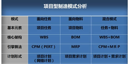 以任务管理为重点的倾向于项目管理软件的运用,这类企业的特点是产品结构并不复杂、外协件、采购件比例较高,装配为主。关注设计、发运和安装调试。以物料为主的项目制造往往产品结构比较复杂、自制件较多。而混合型的项目制造则二者都很关注。