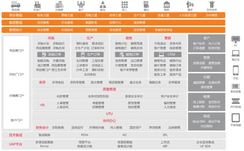 3.经营平台:U8+在精细管理的基础上,还为企业应对挑战创新经营提供平台支撑,包括集成化电商、营销服务一体化、条码物流管控等新技术、新模式。