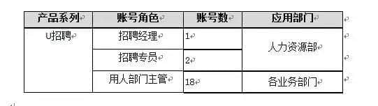 佳禾食品公司的人力资源产品包括人事管理、考勤管理、薪资管理、员工自助、经理自助、U招聘等模块。U招聘的应用涉及人力资源部和各业务部门主管人员。