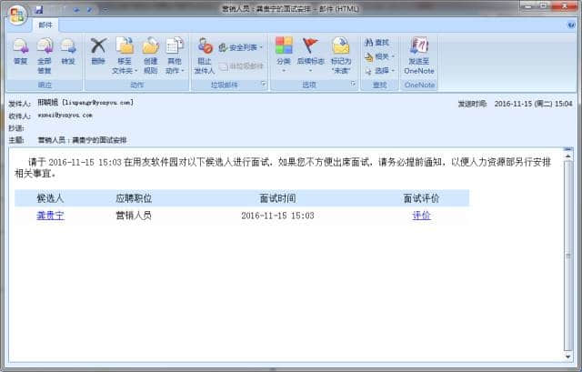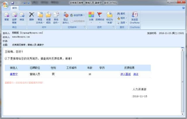 可以通过多种灵活方式对推送的候选人简历方式,既可以在邮件中直接对候选人的简历进行反馈,也可以登陆U招聘系统进行简历反馈。