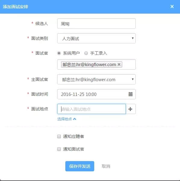 用人部门主管对候选人的简历反馈后,HR招聘专员可实时收到待安排面试的业务通知,并根据近期的面试日程表安排合理的面试时间,安排具体的面试时间、面试地点、面试官。