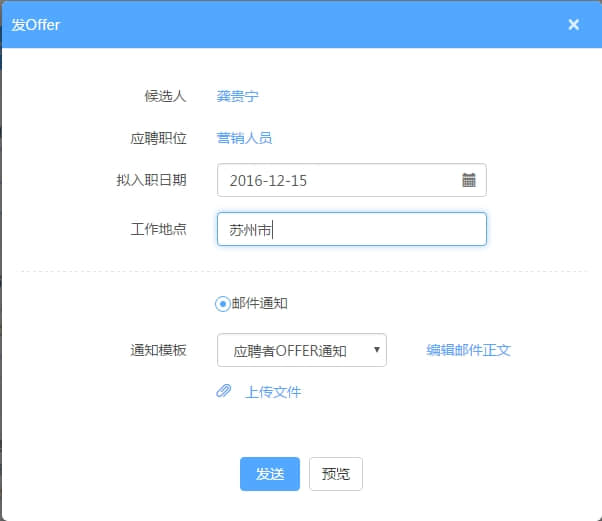 录用申请审批通过后,与候选人沟通拟入职时间和薪酬待遇,并实时发送OFFER通知给候选人。