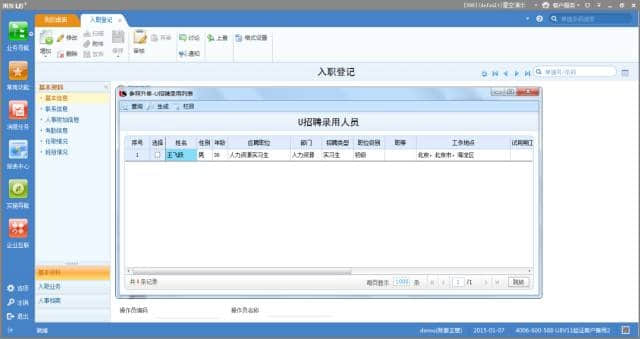 终面通过人员,可以便捷在U招聘系统中提交录用申请单,部门主管、人力资源经理核实编制情况,审批完成后,对候选人发送OFFER,进行入职处理。