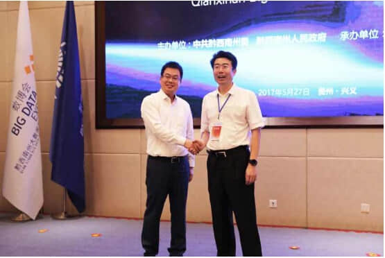 黔西南州纪委书记、州大数据指挥部指挥长刘良(右)与北京用友政务软件公司总裁范斌成(左)论坛上合影