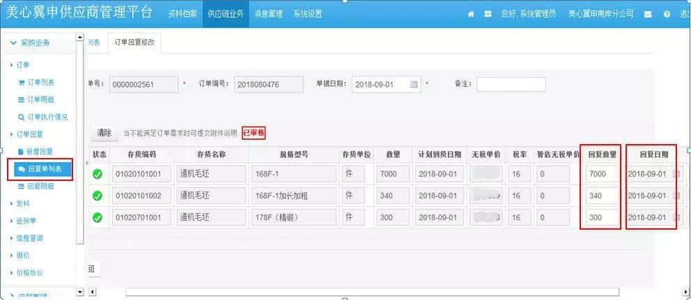 通过上了供应商管理平台,我们将采购计划从ERP下达自动生产采购订单,我们供应商在采购平台里面进行确认回复,所有的信息都是同步。并且还在系统里签订价格协议,自动进行对帐挂帐,然后开票,包括质量的追溯,所有都在系统自动完成。这里展示的订单回复的界面,这张表上可以看到哪个供应商的什么产品?下达的计划是多少,供应商回复的数量和能够送货日期,都可以清晰的展现出来。供应商可以随时查询相关的信息。