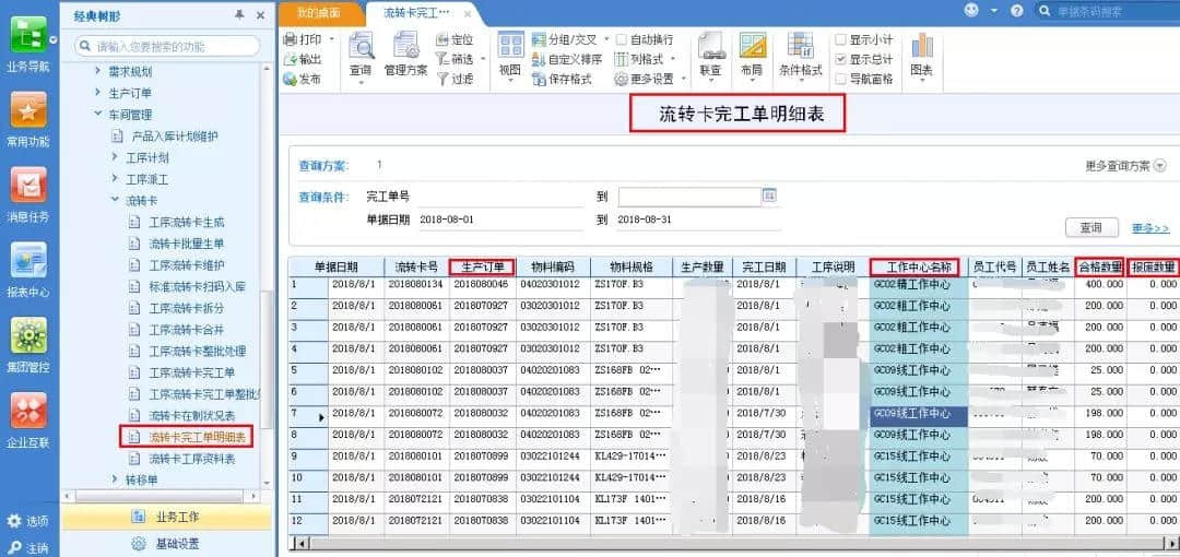我们上线了这个计件工资系统,这个系统的主要原理,对每一个工序,每一个员工他做的每一件产品都用条码扫描,然后来进行报工,系统就会自动计算出员工的合格品产品报废数量和他的工资。这是我们的一张报工表,这个表里面可以看到,有流转卡的卡号,有生产订单的订单号,有产品的明晰,有下给员工的计划数量,就是这张流转卡你要做多少数量,有员工的编号和姓名,有产品对应的工资,所以说员工是可以随时查询他的产量和他的工资情况。