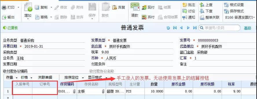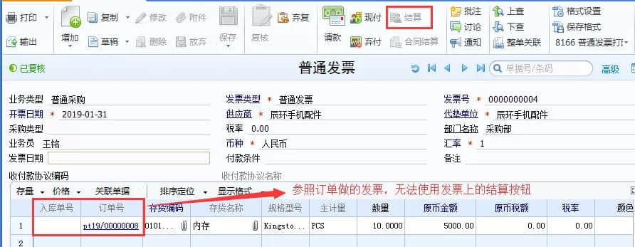 手工录入或参照订单做的发票,无法使用发票上的结算,此发票只能在【采购结算】-【手工结算】中勾选入库单和发票做手工结算;