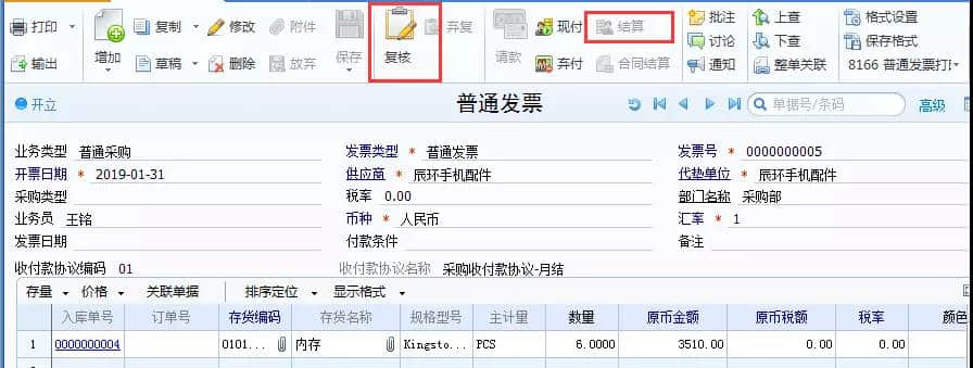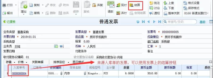 1、在发票上点击结算,发票必须来源入库单且发票需复核;
