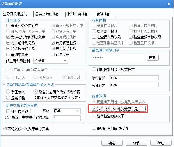 2、如采购选项中勾选“选单只含已审核的发票”,发票必须在应付管理中审核后才能结算。