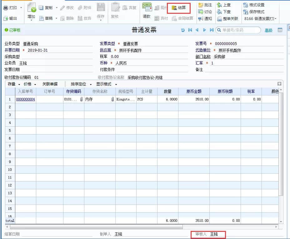 来源入库单的已复核的发票,应付模块审核后,此发票上的结算按钮可以点击。