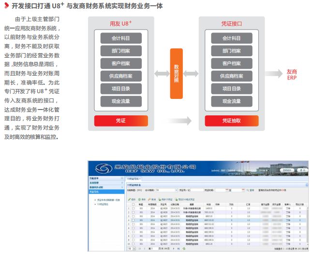 黑旋风锯业为了实现本企业业务管理和总部财务上报的双重诉求,通过 U8+ 核心业务平台建设,并且开发出业务与友商的 ERP 接口,自动上传凭证,保证了 业务财务数据的一致性和连贯性。也通过物料复杂属性的清晰管理和生产工艺的可视管理,保障 了产品工艺技术指标和产品品质的一致性和连贯性,为企业组织效能提升扩大了空间。