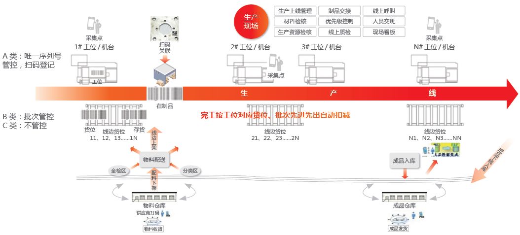 在车间现场中,实现了人员设备的现场派工、工程变更、产出数现场采集和管理等。在机台与岗位上,通过PDA扫描条码,实时采 集生产现场的工序进度、投料、工序检验等相关数据,实现车间生产数据完全透明化,让管理人员可实时了解到在制品、质量、物流等情况, 实现生产现场全覆盖无死角,PDA数据移动采集、实时传输、操作便捷。