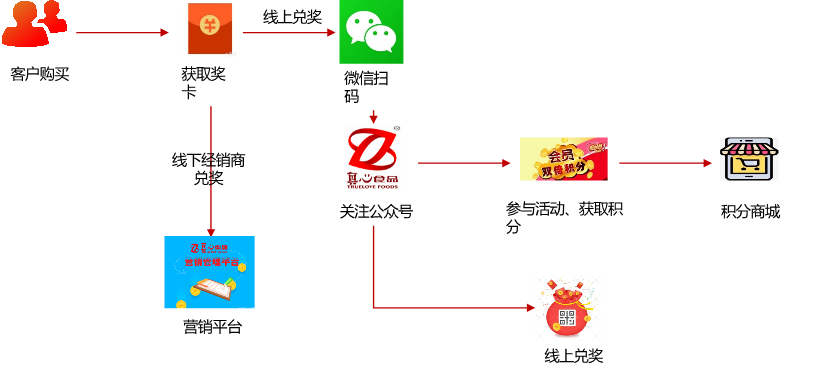 消费者消费真心的商品,线上有奖卡,每袋真心瓜子都有一张卡片,扫一下二维码就会中奖,百分之百中奖,关注公众号就可以直接提取用了。还有一种方式是不但有微信红包还能同时得到积分,到官方网站去兑现积分,当现金使用。让消费者成为会员,让会员重复消费。