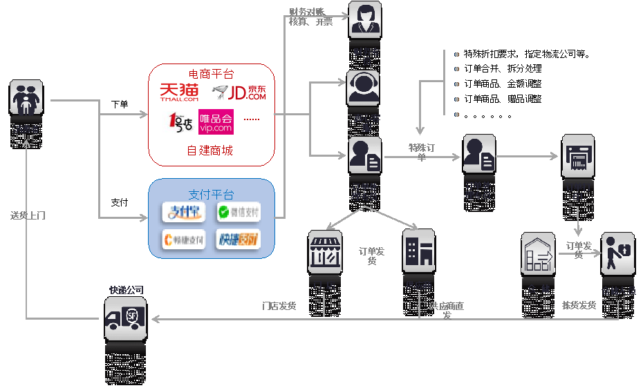 零售终端与会员管理,是线上线下结合的。线上消费的全过程:从线上平台下订单,通过线上进行支付,财务确认款到账,再由订单人处理。食品行业企业往往为追求新鲜度采用就地配送的原则,在门店里配送,真心目前也正在推进在终端门店和系统结合,以后就会是你今天在网上购物平台下了单,楼下超市就把产品给你送上去了,这是我们未来一个预期。