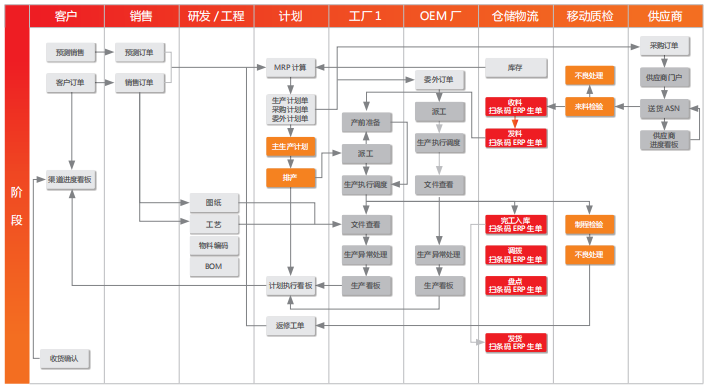 以 ERP 为中心实现供应链管理、生产管理、外发管理、财务核算、预算、主数据管理应用。