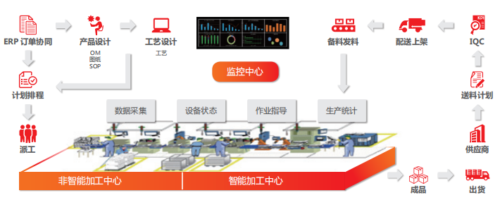 与底层自动化设备控制系统打通,引入 AGV 智能导小车代替人工搬运,实现了对车间的人、机、料、法、环、质等生产要素进行全面管控, 以及精益制造和数字化管理。