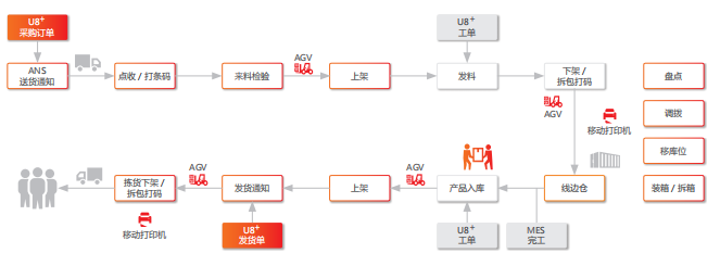 与 ERP 业务协同,账实同步:与 U8+ 实现业务流程协同、WMS 自动生单,做到账实同步,提高数据及时准确性。