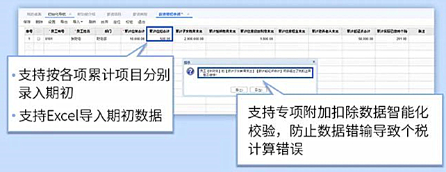 通过初始化-薪资余额-薪资期初余额,进入薪资期初余额页,可随时开启系统使用。期初余额数据支持按员工姓名导入,薪资核算单在核算时可自动根据员工取值计算累计。