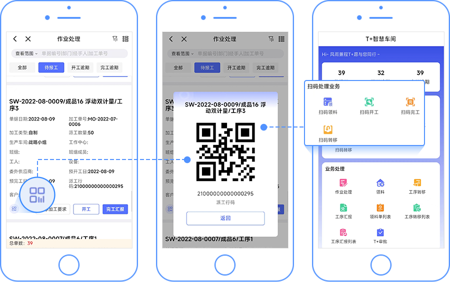 在作业处理和派工单详情页面增加二维码显示,点击后该派工单的派工行码以二维码形式进行展示,工人可以使用自己的任务进行领料或者转移交接。