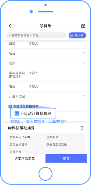领料单表头增加”不自动计算换算率“选项,勾选后,单据中换算率保持不变,录入数量2后自动反算数量1,选项支持记忆,默认隐藏在单据表头中,点击“展开表头”后进行设置。